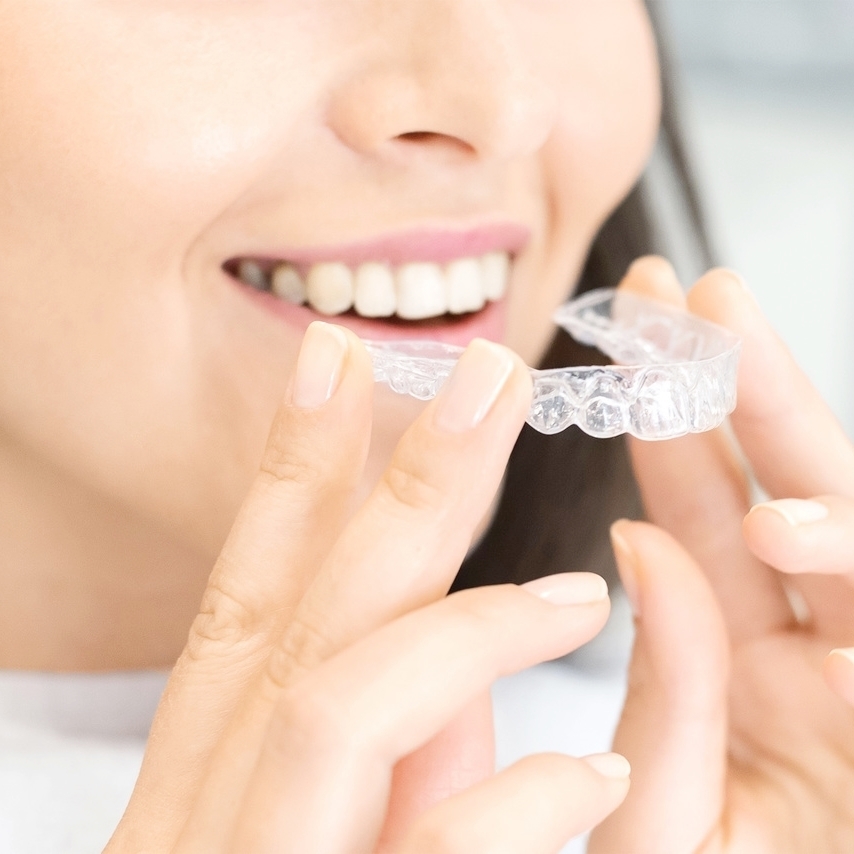当院で導入しているインビザラインは、そのようなお悩みの解決に役立てると考えております。矯正装置が透明なマウスピースであるため、従来の金属を使った装置に比べて目立ちにくいのが特徴です。